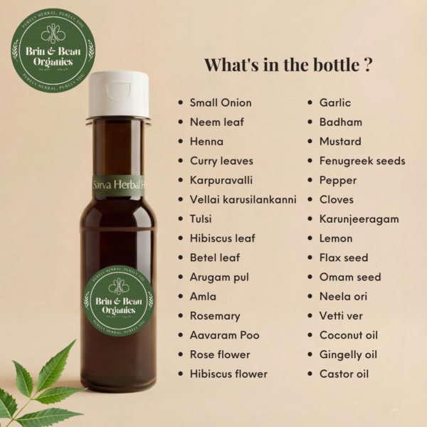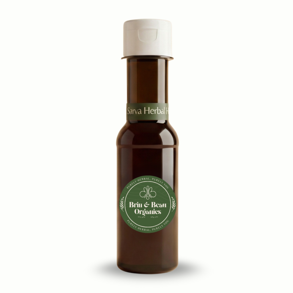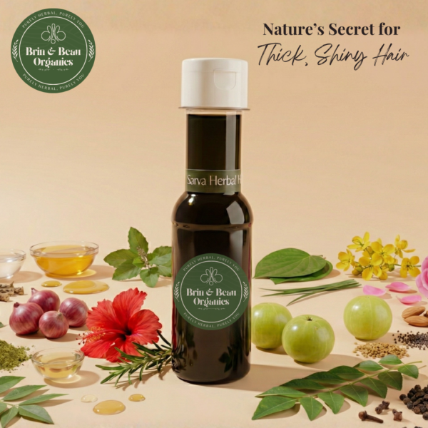 Brin & Beau Organics Sarva Herbal Hair Oil is a time-tested blend of powerful herbs and nourishing oils, carefully crafted to restore hair health naturally. Rooted in traditional wisdom, this herbal formulation strengthens hair from the roots, reduces hair fall, and promotes healthy, thick, and shiny hair with regular use.